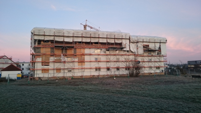 zum schutz der darunter liegenden wohnungen wurde über dem gesamten gebäude ein schutzdach errichtet.