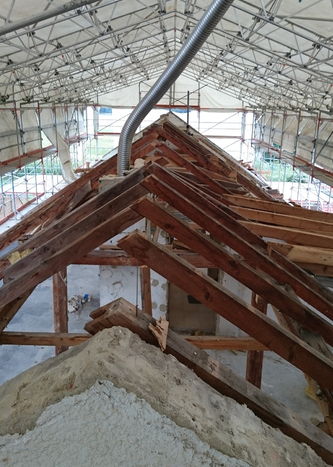 während die weniger getroffenen häuser mit relativ geringem aufwand wieder saniert werden konnten, musste an den häusern 12,12 a+b der dachstuhl abgetragen und neu errichtet werden.